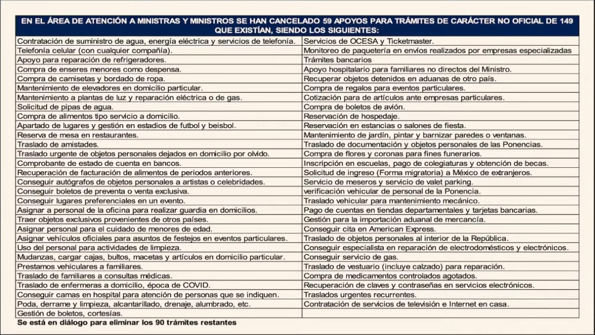 Pero más allá de la reducción y eliminación de los privilegios económicos, Sheinbaum exhibió un listado de trámites no oficiales que los ahora ministros en retiro exigían al personal de la Corte que realizara.