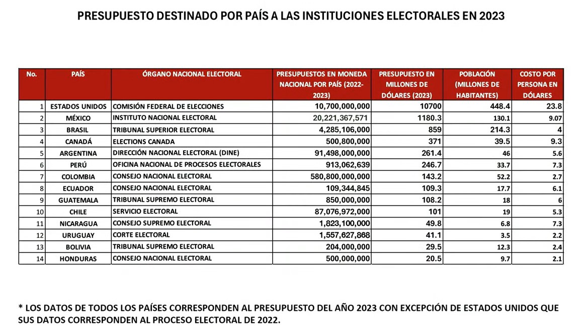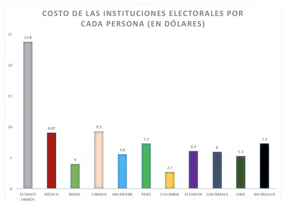 En conferencia, dijo que de acuerdo a la información con la que cuenta, solamente en Estados Unidos y en Canadá, el costo por elector es superior al del país, con 21.8 y 9.3 dólares por elector, en tanto que en México asciende a 9.1 dólares