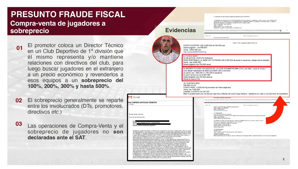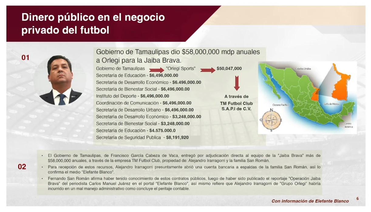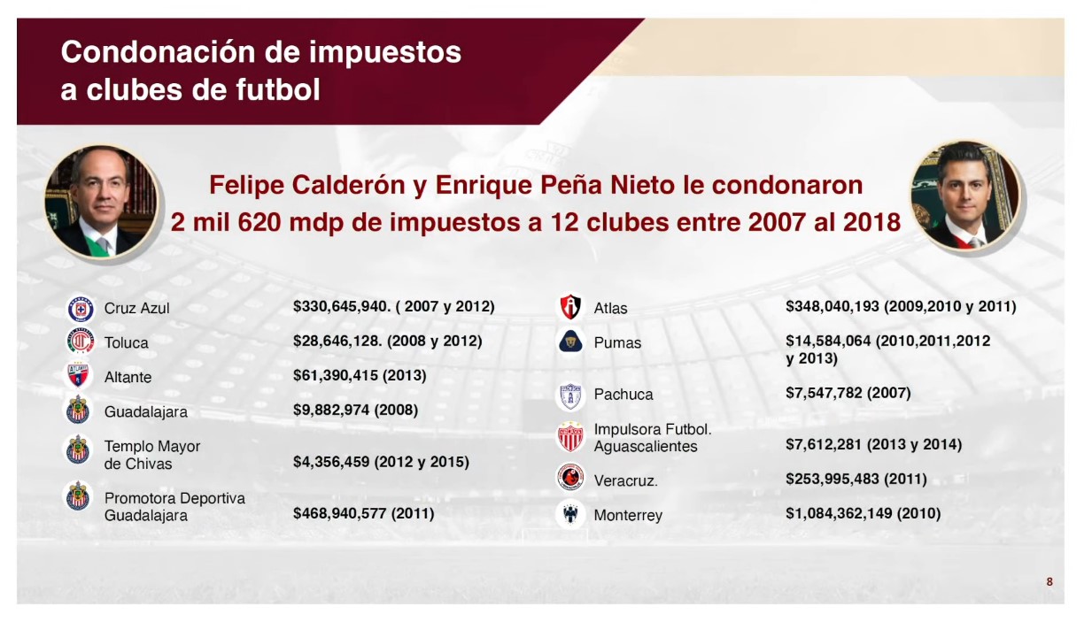 Como parte de la información presentada en la conferencia, basada en un reportaje de investigación, se reveló que entre los gobiernos de Felipe Calderón y de Enrique Peña Nieto condonaron a 12 clubes de la Liga Mx 2 mil 620 millones de pesos entre 2007 y 2018.