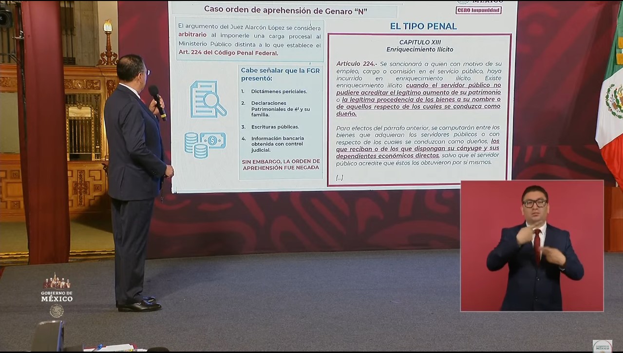 De acuerdo con la información que dio a conocer el subsecretario durante la mañanera presidencial, el pasado 10 de mayo el juez de distrito especializado en el sistema penal acusatorio, Gerardo Genaro Alarcón López, rechazó la detención del ex funcionario bajo el argumento que “no basta con que exista desproporción entre lo que percibió el imputado y su haber patrimonial, sino que el incremento debe derivarse de actividades ilícitas relacionadas con el ejercicio de la función pública y no de otras fuentes”.