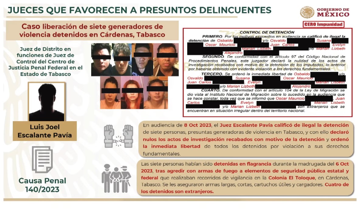 Asimismo, Rodríguez Bucio también se refirió a la decisión del juez de distrito en funciones de juez de control del Centro de Justicia Penal Federal en Tanasci, Luis Joel Escalante Pavia, quien dejó en libertad a siete generadores de violencia, cuatro de ellos extranjeros, en ese estado, aun cuando fueron “detenidos en flagrancia” cuando habrían agredido con armas de fuego a elementos estatales y federales de seguridad pública.