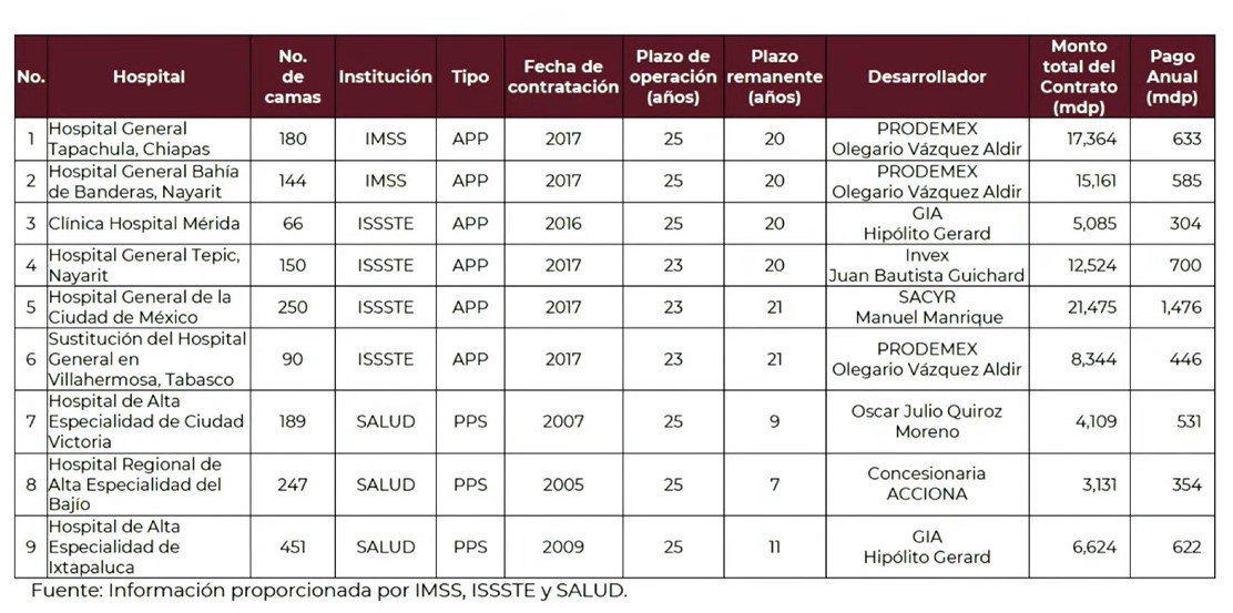 Dos de los hospitales están concesionados a la empresa GIA, propiedad de Hipólito Gerard —cuñado del ex presidente Carlos Salinas de Gortari—; uno a Invex, de Juan Bautista Guichard; otro a SACYR, de Manuel Manrique; uno más para Oscar Julio Quiroz Moreno; y otro a Concesionaria ACCIONA; además de tres a Prodemex, propiedad de Olegario Vázquez Aldir.