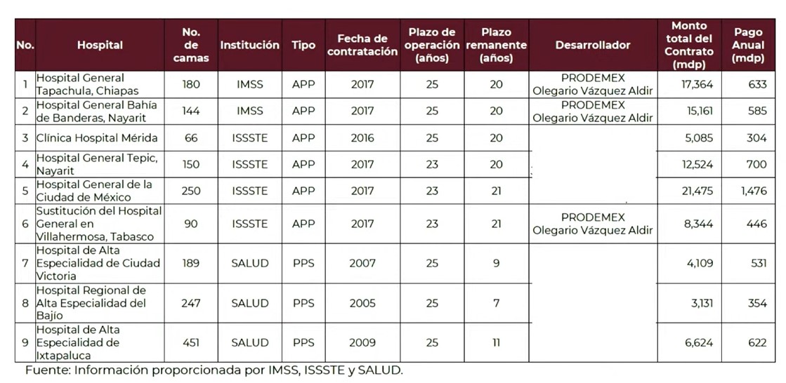 En la mañanera del presidente Andrés Manuel López Obrador se exhibieron por primera ocasión los nombres y empresas a los que en gobiernos pasados fueron concesionados nueve hospitales bajo un esquema de asociación público-privada y cuestan una cifra millonaria al erario.