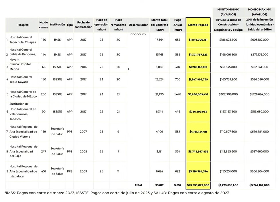 En tanto que el hospital de Villahermosa, Tabasco, operado por el ISSSTE, y también concesionada a Prodemex, el pago anual por parte del gobierno es de 446 millones y una suma total del contrato de 8 mil 344 millones de pesos.