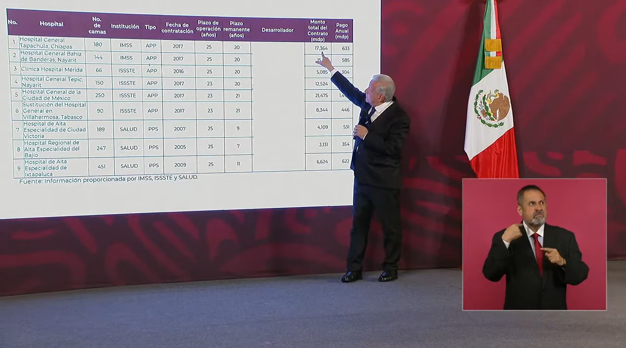 En la mañanera del presidente Andrés Manuel López Obrador se exhibieron por primera ocasión los nombres y empresas a los que en gobiernos pasados fueron concesionados nueve hospitales bajo un esquema de asociación público-privada y cuestan una cifra millonaria al erario.