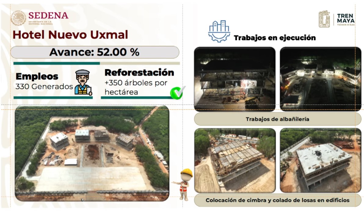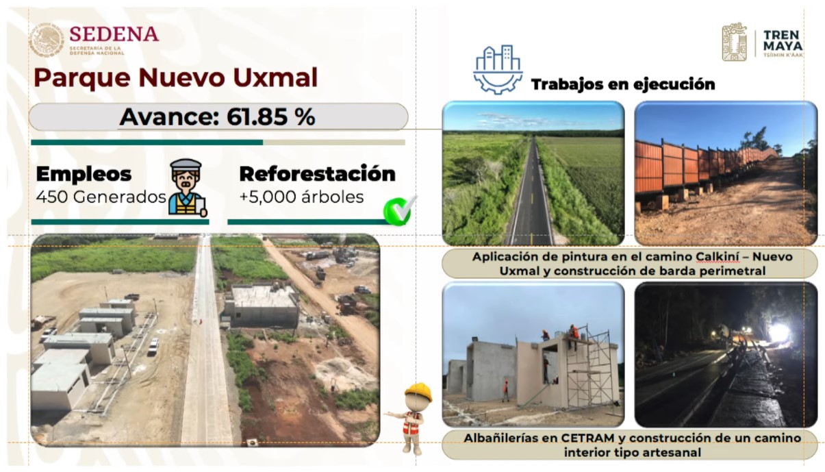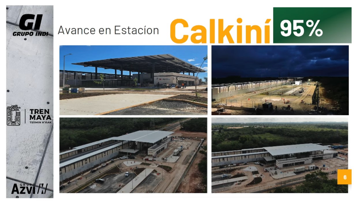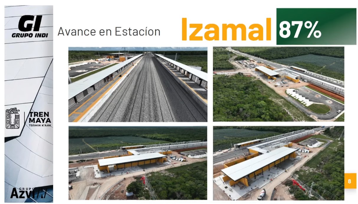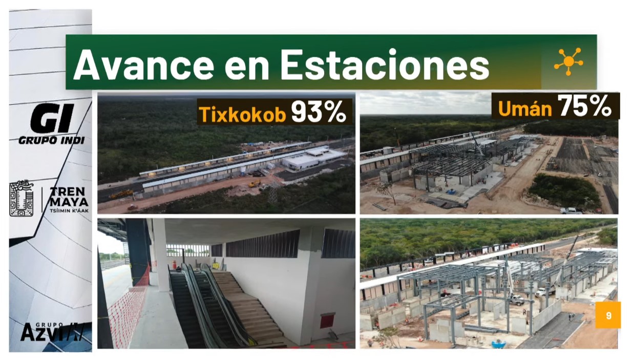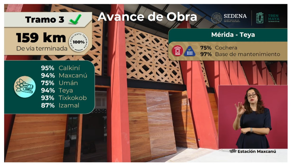 Están concluidos 159 kilómetros de vía, de los cuales 60 kilómetros corresponden a vía doble electrificada. Los porcentajes de desarrollo de estaciones que cruzan 15 municipios de Campeche y Yucatán son: