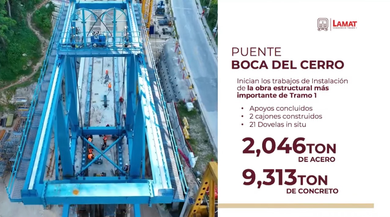 El presidente López Obrador reiteró que el viernes 15 de diciembre será inaugurado el tramo del Tren Maya de Palenque, Chiapas a Cancún, Quintana Roo. El principal desafío a resolver en las próximas semanas es la conclusión del puente Boca del Cerro, ubicado en Tenosique, Tabasco, que cruzará el río más grande de México: el Usumacinta.