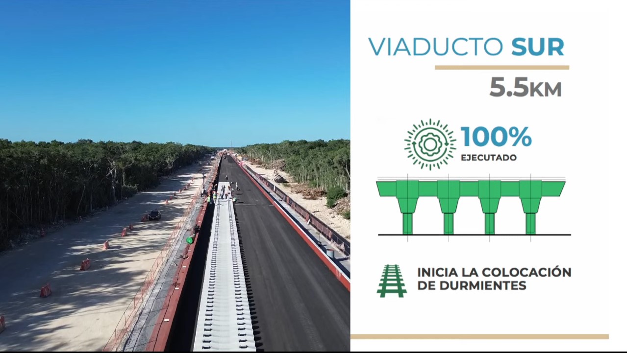 En el tramo 5 sur, encabezado por consorcios de construcción, continúa la edificación de tres viaductos que suman 21 kilómetros terminados, la estación Tulum, el puente atirantado Garra de Jaguar, obra que abarca 84 pilas, 17 trabes fabricadas y dos zapatas colocadas. También se desarrolla la conexión de Playa del Carmen con Puerto Aventuras en 42.5 por ciento de obra general.