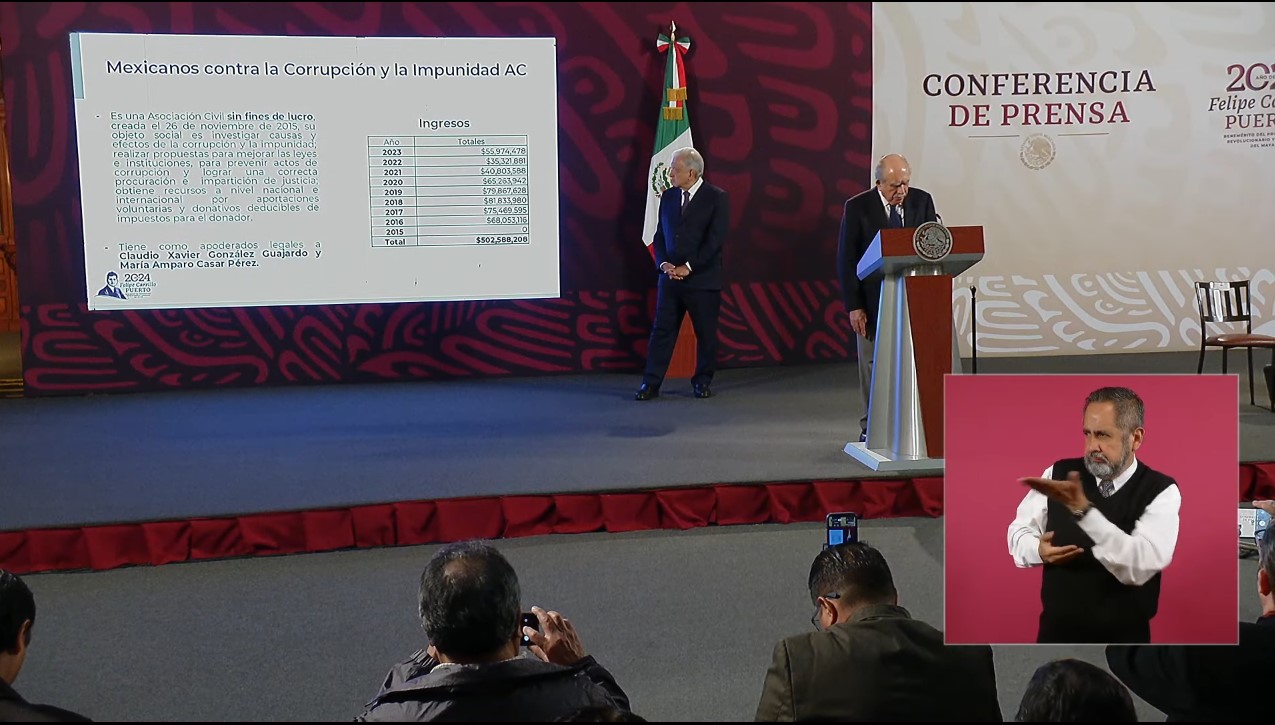 En una larga exposición durante la conferencia mañanera en Palacio Nacional detalló los montos, las empresas y particulares que han entregado recursos a la asociación civil, así como el destino que han tenido estos fondos. Destaca el pago por servicios de sus fundadores: María Amparo Casar Pérez cobró entre 2016 y 2023 26 millones 514 mil 57 pesos a Mexicanos contra la Corrupción, mientras que su otro fundador, Claudio X. González Guajardo, recibió 11 millones 244 mil 873 pesos entre 2016 y 2020.