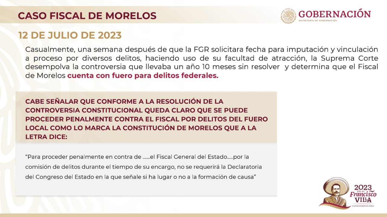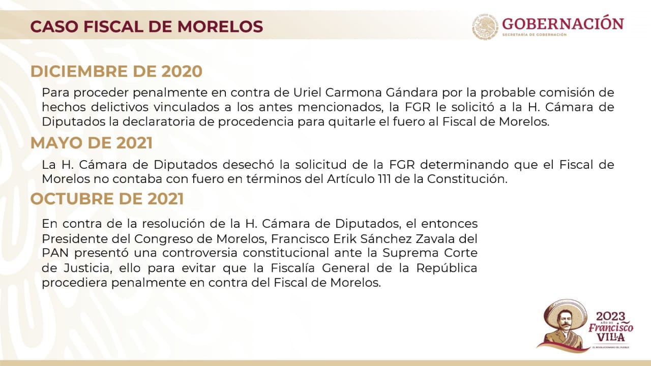 La secretaria recordó que en diciembre de 2020 la Fiscalía General de la República, para poder proceder en contra del fiscal morelense, solicitó a la Cámara de Diputados la declaratoria de procedencia para poder quitarle el fuero, pero en mayo de 2021 ese órgano legislativo desechó esa solicitud.