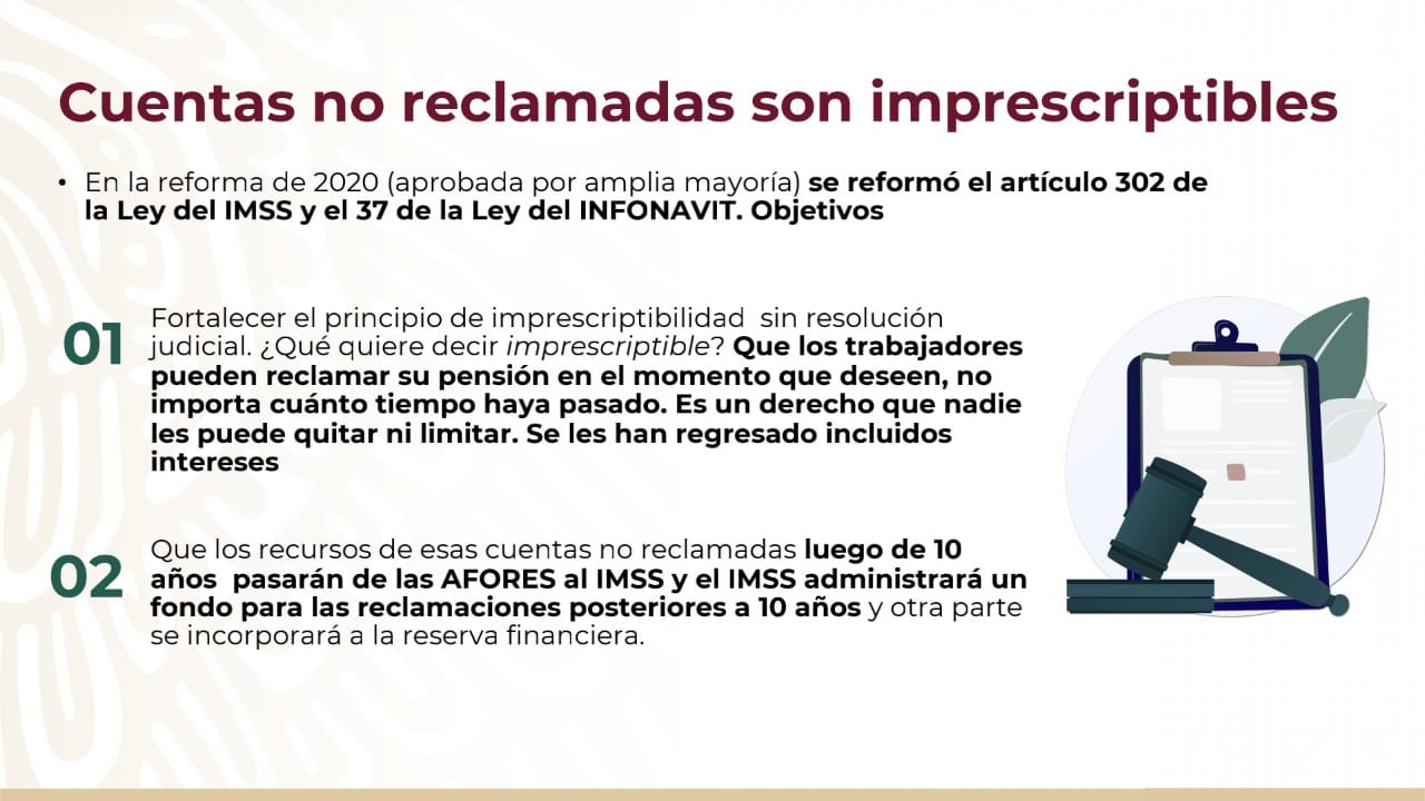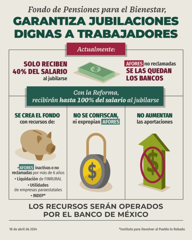 El Gobierno federal, a través de los titulares de las secretarías de Gobernación, del Trabajo, del Instituto del Fondo Nacional de la Vivienda para los Trabajadores (Infonavit) y la Comisión Nacional del Sistema de Ahorro para el Retiro (Consar), aclararon que la iniciativa para crear el Fondo de Pensiones para el Bienestar y transferir a éste los ahorros para el retiro y vivienda no reclamados por los trabajadores mayores de 70 años no es una expropiación y explicaron a detalle cómo funciona actualmente el Sistema de Pensiones en México.