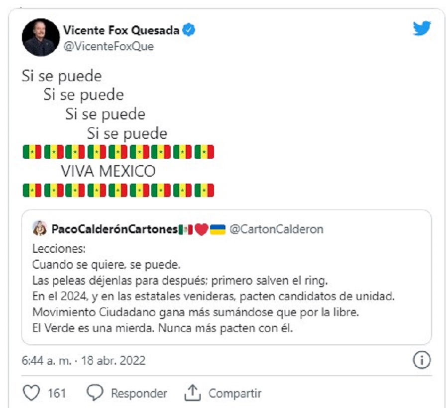 “Cuando se quiere, se puede. Las peleas déjenlas para después; primero salven el ring. En el 2024, y en las estatales venideras, pacten candidatos de unidad. Movimiento Ciudadano gana más sumándose que por la libre. El Verde es una mierda. Nunca más pacten con él”, publicó en su característico y prolífico lenguaje Calderón Cortés, monero de Grupo Reforma.
