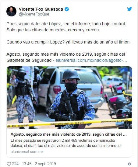 Este viernes, Fox recurrió de nuevo a Twitter para dirigir un mensaje a López Obrador en la que mezcla referentes a la Independencia de México y termina con la expresión religiosa “amén”: