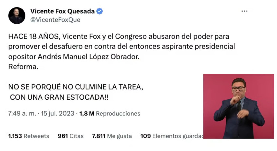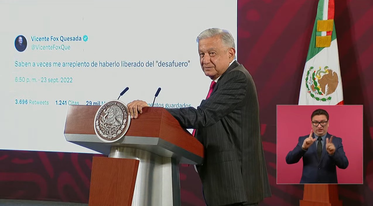El presidente dio a conocer que recientemente, en sus redes sociales, Fox manifestó su arrepentimiento de no haber dado “la estocada” final a López Obrador entonces, y proyectó en las pantallas del Salón Tesorería dos tuits del ex mandatario.