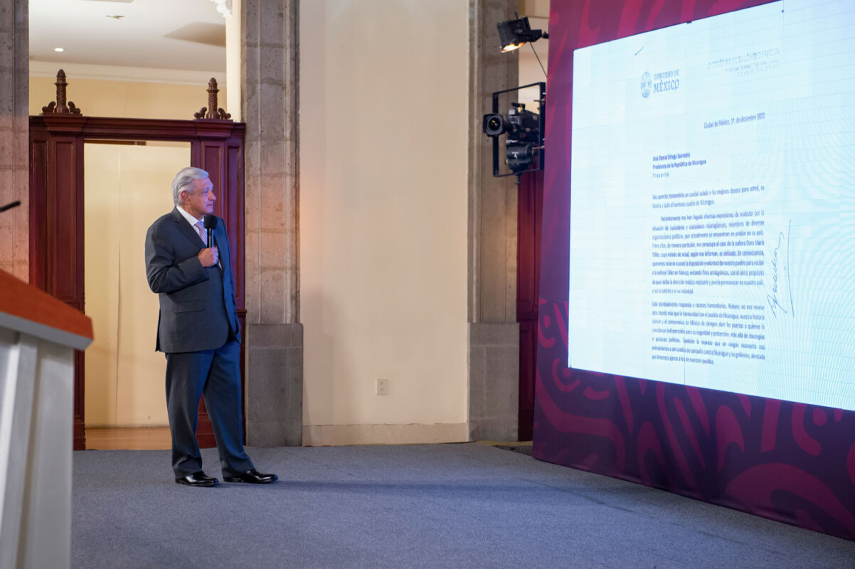 El jefe del Ejecutivo presentó una carta que envió el 1º de diciembre de 2022 al presidente de la República de Nicaragua, Daniel Ortega Saavedra, en la que aborda la disposición y voluntad de México de recibir a Dora María Téllez —guerrillera sandinista— y a cualquier persona presa que requiera refugio como un acto humanitario.