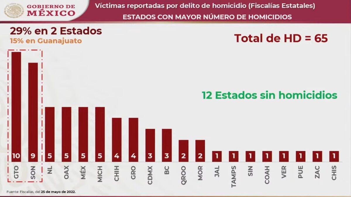 El presidente Andrés Manuel López Obrador afirmó que de 65 homicidios cometidos en el país el miércoles, 10 (15 por ciento) ocurrieron en Guanajuato, entidad de gobierno panista, lo que la convierte en el estado con mayores índices de ese delito.