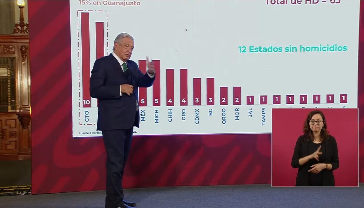 El presidente Andrés Manuel López Obrador afirmó que de 65 homicidios cometidos en el país el miércoles, 10 (15 por ciento) ocurrieron en Guanajuato, entidad de gobierno panista, lo que la convierte en el estado con mayores índices de ese delito.