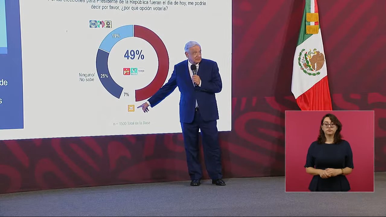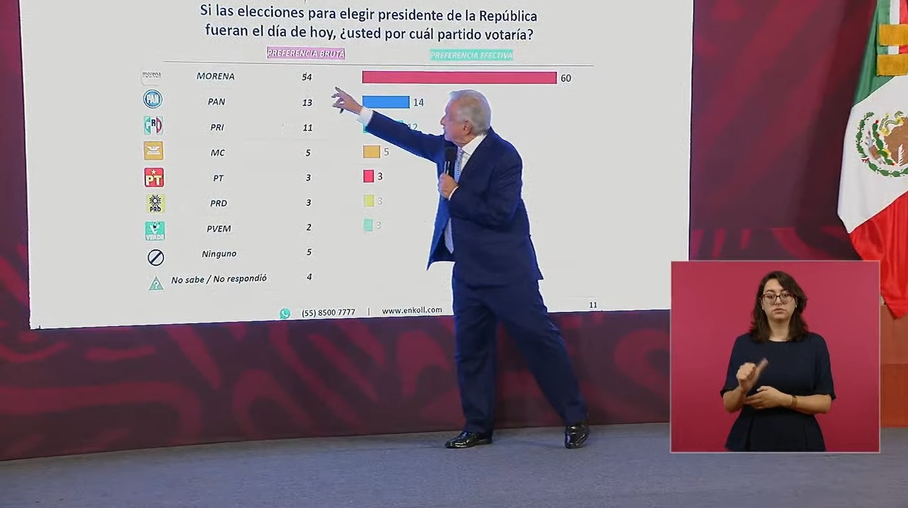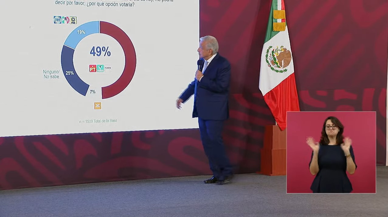 Durante su conferencia, el presidente difundió sendas encuestas de la empresa Covarrubias y la publicación española El País, según la cual, en el primer caso Morena y sus aliados tienen una preferencia electoral de 49 por ciento que contrasta con el 18 por ciento del Frente Amplio por México (PAN, PRI y PRD). En la segunda, su movimiento.