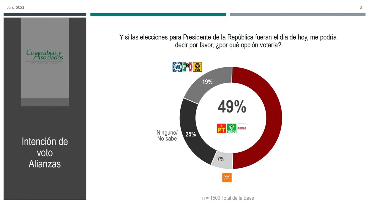 La encuesta “Covarrubias y Asociados” revela que en la intención de voto de la ciudadanía se encuentra con ventaja del 49% la coalición Morena, Partido del Trabajo y Partido Verde Ecologista de México frente a la coalición opositora quienes apenas logran el 19% de intención de voto en la gráfica.