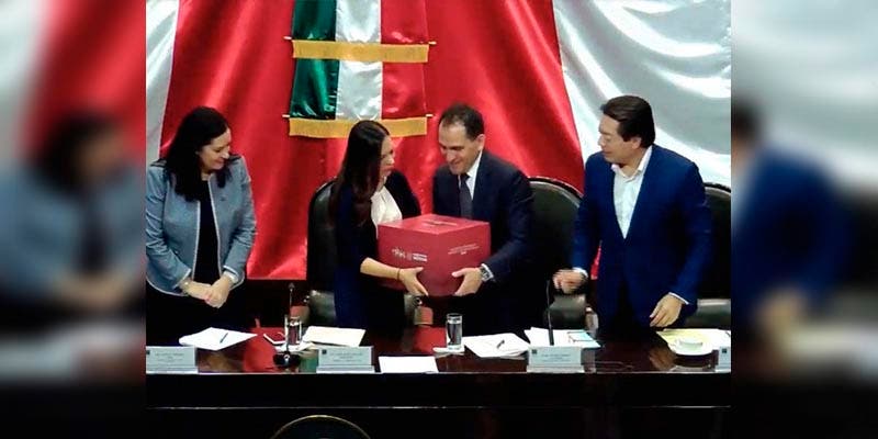 La presidenta de la Mesa Directiva de la Cámara de Diputados, Laura Rojas Hernández, le dio la bienvenida al secretario federal en el Salón Verde, edificio A de San Lázaro en donde entregó el paquete para el año 2020.