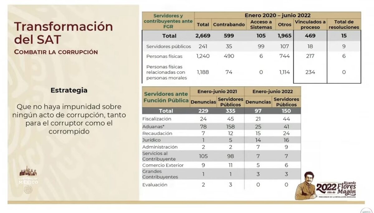 “Quiero destacar, primero, que se ha cumplido con el compromiso de no aumentar impuestos desde que llegamos, no aumento de impuesto. Esto no sucedía antes, y al mismo tiempo no se han creados nuevos. Quiero también, dar a conocer al pueblo de México que se terminó con la práctica de la evasión fiscal y sobre todo, de la condonación de los impuestos, a los altos personajes de empresas bancos a los potentados, que no pagan impuestos, ya no hay condonación de impuestos; lo tercero, es que gracias a esas políticas, tenemos una hacienda pública sana, fuerte. No hemos tenido que recurrir a deuda, no hemos tenido un problema de déficit en cuanto a que se gaste más de lo que ingresa. Y esto tiene que ver mucho con el trabajo de servidores públicos ejemplares, como la directora del SAT, Raquel Buenrostro”, dijo.