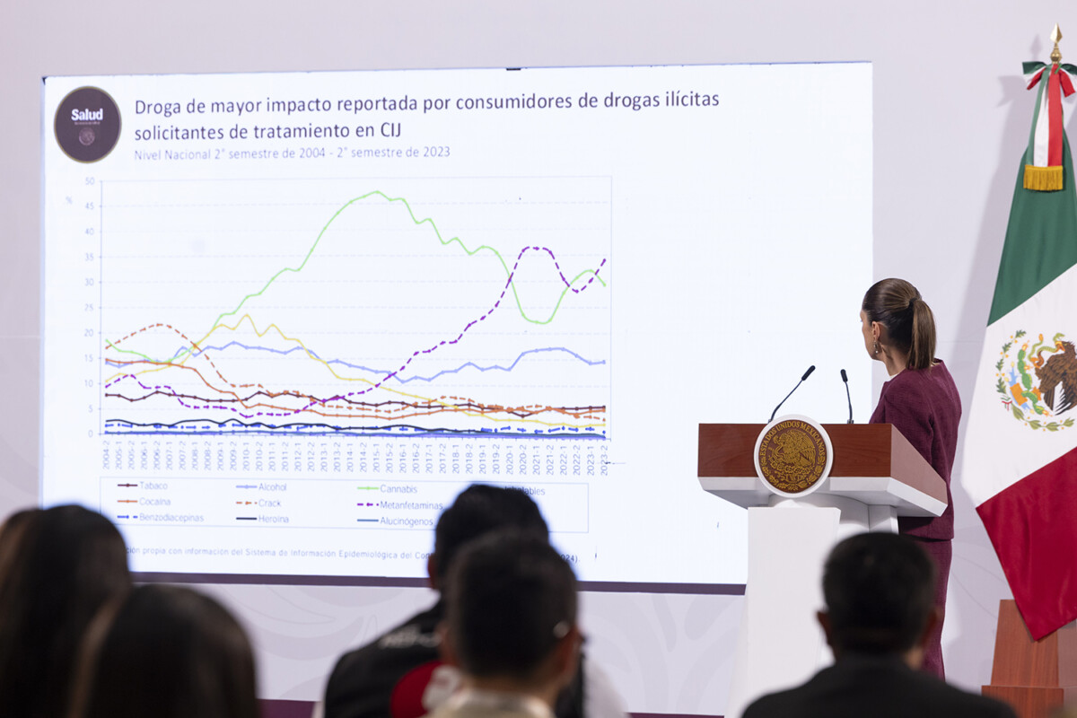 Mostró una gráfica sobre el consumo de drogas reportado por los Centros de Integración Juvenil, en la que, en el segundo semestre de 2023, las metanfetaminas tenían el mayor consumo, por arriba del consumo de cannabis. Detalló que en el caso del fentanilo, no se ha reportado un aumento de consumo.