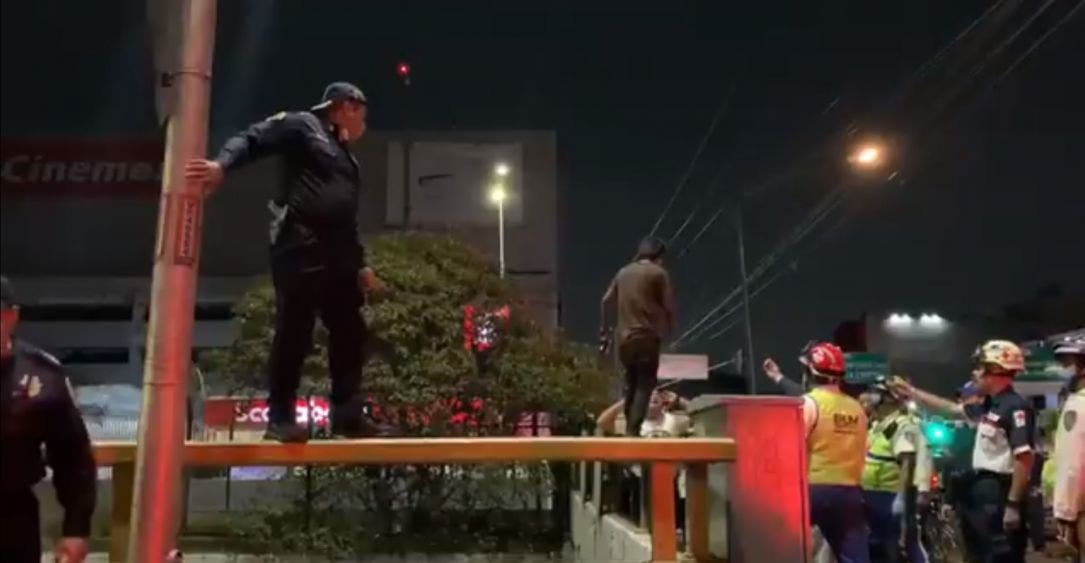 En un video que circula en redes sociales, se observa al joven arriba del muro de contensión de la avenida y a un grupo de hombres pertenecientes al Escuadrón de Rescate y Urgencias Médicas (ERUM), policías y personal de la Cruz Roja tratando de persuadirlo para que no se arroje al vacío.
