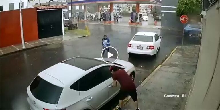 En un video que fue captado por la cámara de seguridad se observa como los asaltantes se bajaron de un automóvil Jetta blanco para despojar al conductor del vehículo Seat que se encontraba estacionado.