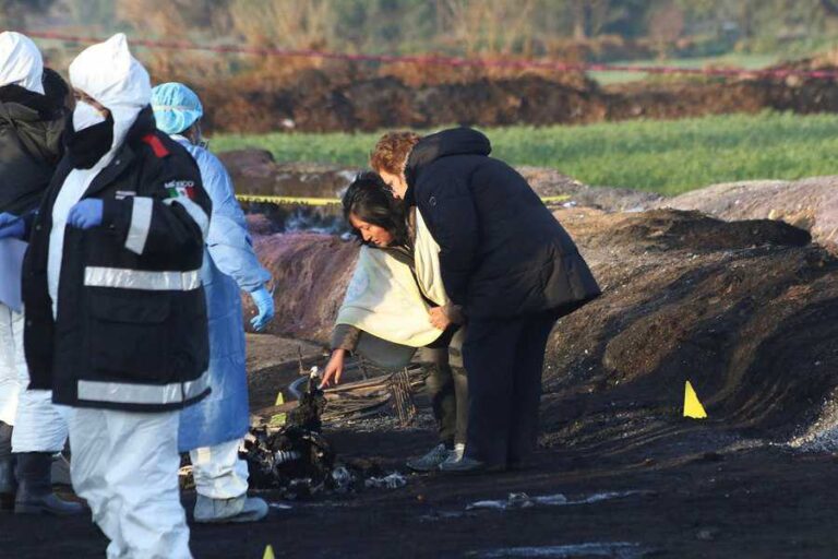 MEX104. TLAHUILILPAN (MÉXICO), 20/01/2019.- Expertos forenses trabajan este, sábado en el sitio donde 66 personas han muerto al estallar una toma clandestina de gasolina de Petróleos Mexicanos (Pemex) en Tlahuelilpan (México). El número de muertos por la explosión de una toma clandestina de gasolina en el central estado mexicano de Hidalgo ha subido de 21 a 66 personas en las últimas horas, informaron hoy fuentes oficiales. "El saldo que tenemos al momento de lo ocurrido en Tlahuelilpan es de 66 personas fallecidas y 76 personas heridas que están siendo atendidas en distintos hospitales", indicó en Twitter el Gobernador estatal, Omar Fayad. EFE/STR