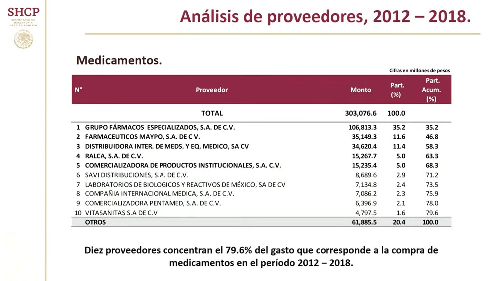 En respuesta a una pregunta, el mandatario planteó que, en el periodo 2012-2018, diez proveedores manejaban prácticamente 80 por ciento de la venta de medicamentos, de un total de más de 303 mil millones de pesos que el Estado mexicano destinaba a ese rubro.