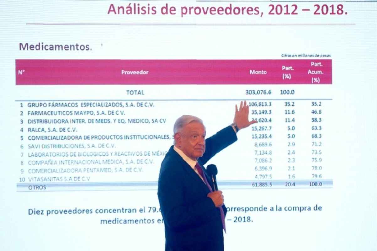 En respuesta a una pregunta, el mandatario planteó que, en el periodo 2012-2018, diez proveedores manejaban prácticamente 80 por ciento de la venta de medicamentos, de un total de más de 303 mil millones de pesos que el Estado mexicano destinaba a ese rubro.