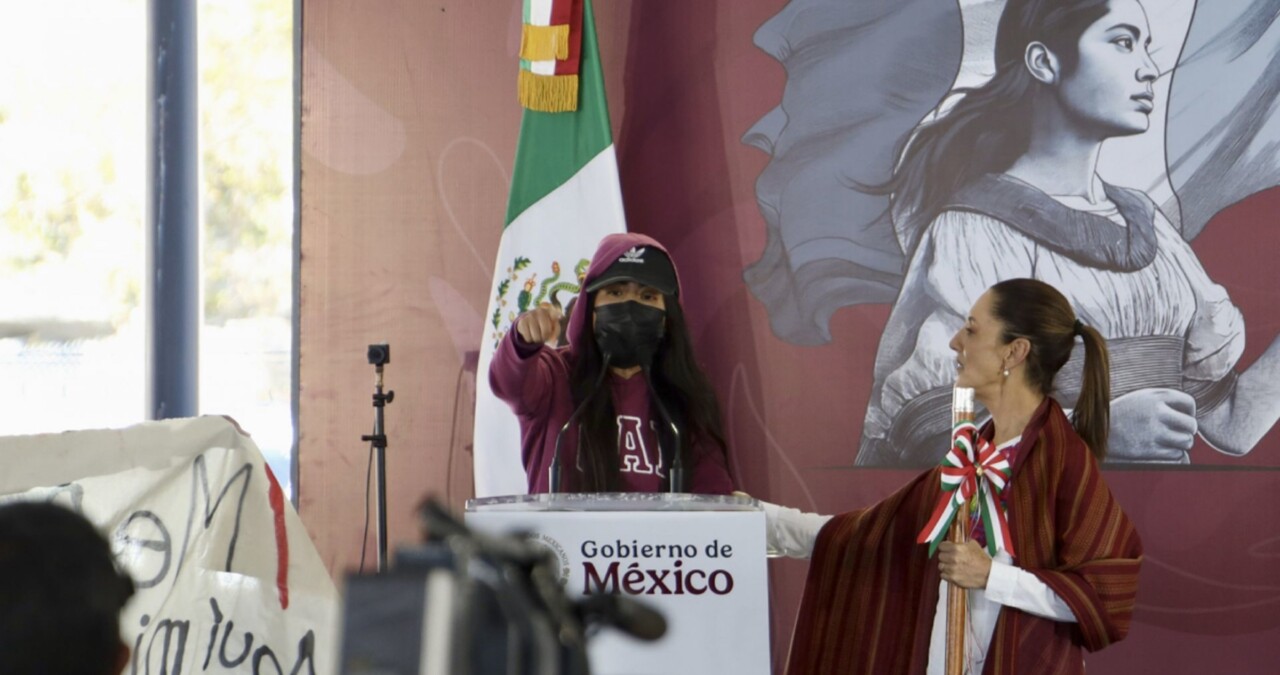 Al momento en que la presidenta concluyó su mensaje, subió al templete de manera sorpresiva la saxofonista María Elena Ríos, víctima de feminicidio en grado de tentativa.