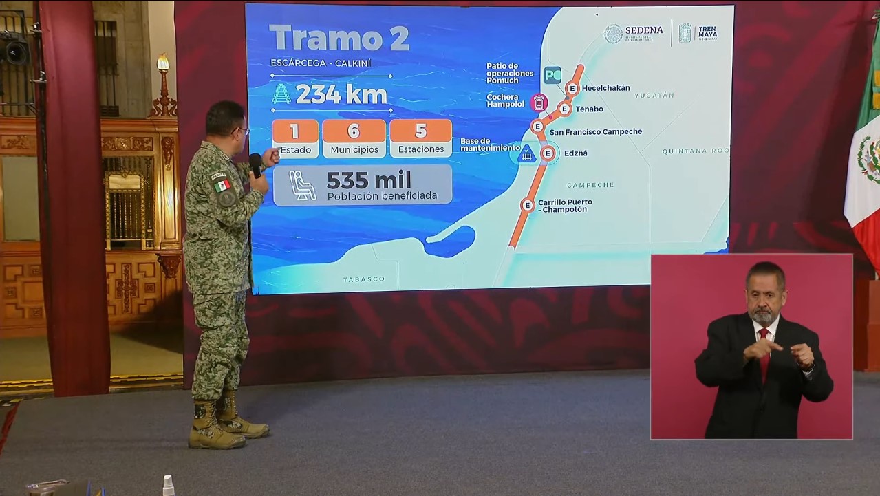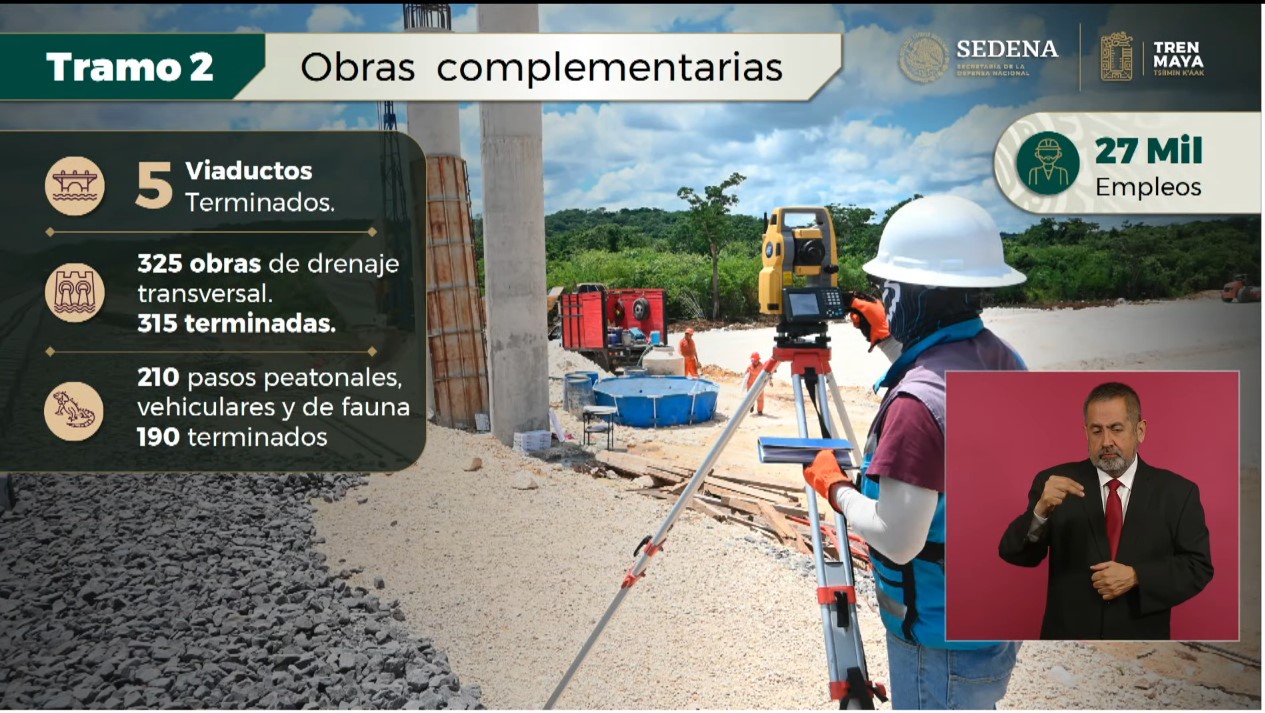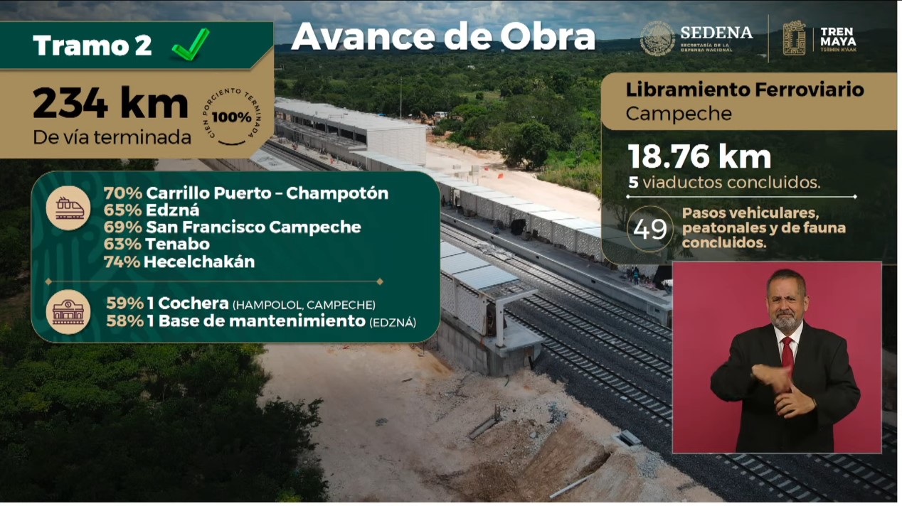 El subtramo sur (Escárcega-Chiná) alcanzó el 100 por ciento de instalación de vía. Están completas 179 obras de drenaje, 108 pasos por debajo de la vía, puentes y viaductos; adicionalmente se desarrollan 31 pasos por encima de la vía. Estos proyectos han generado 6 mil 068 empleos directos.