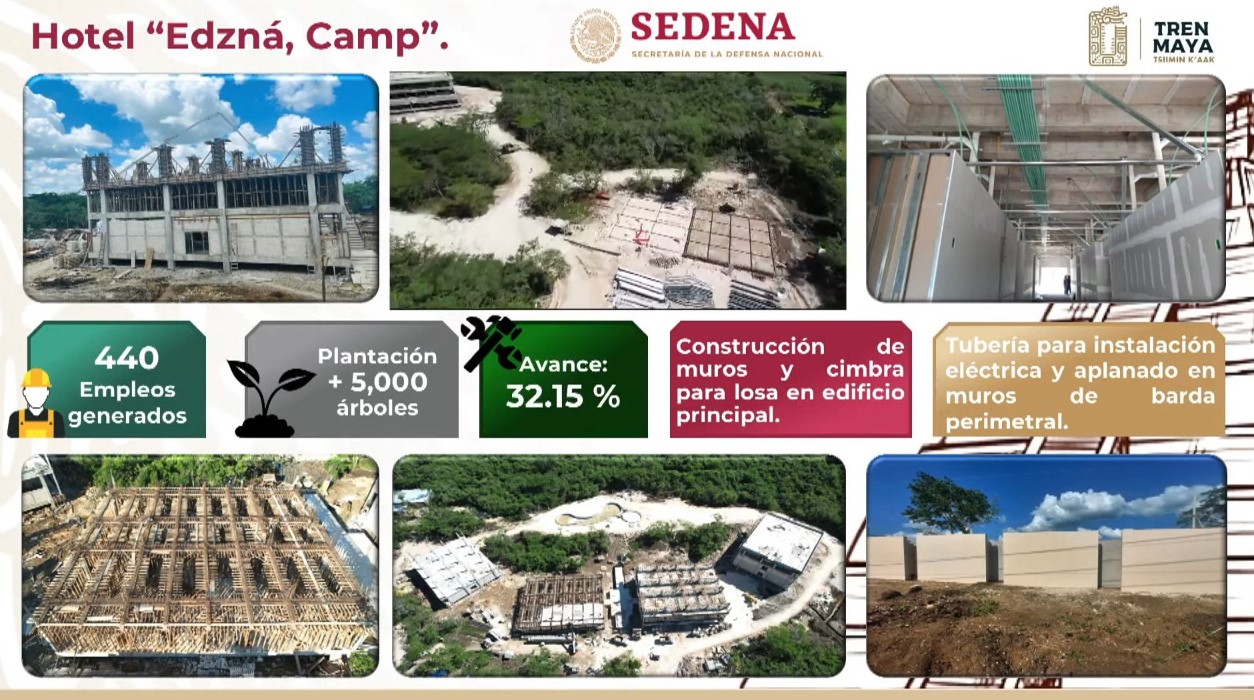 La Secretaría de la Defensa Nacional (Sedena) colabora en la construcción del hotel Edzná, que tiene un desarrollo del 32.15 por ciento en la construcción de muros y cimbra para losa en el edificio principal con diseño ecológico. Contempla la plantación de más de cinco mil árboles, apuntó el jefe del Centro Coordinador de Operaciones del Tren Maya, Blas Andrés Núñez Jordán.