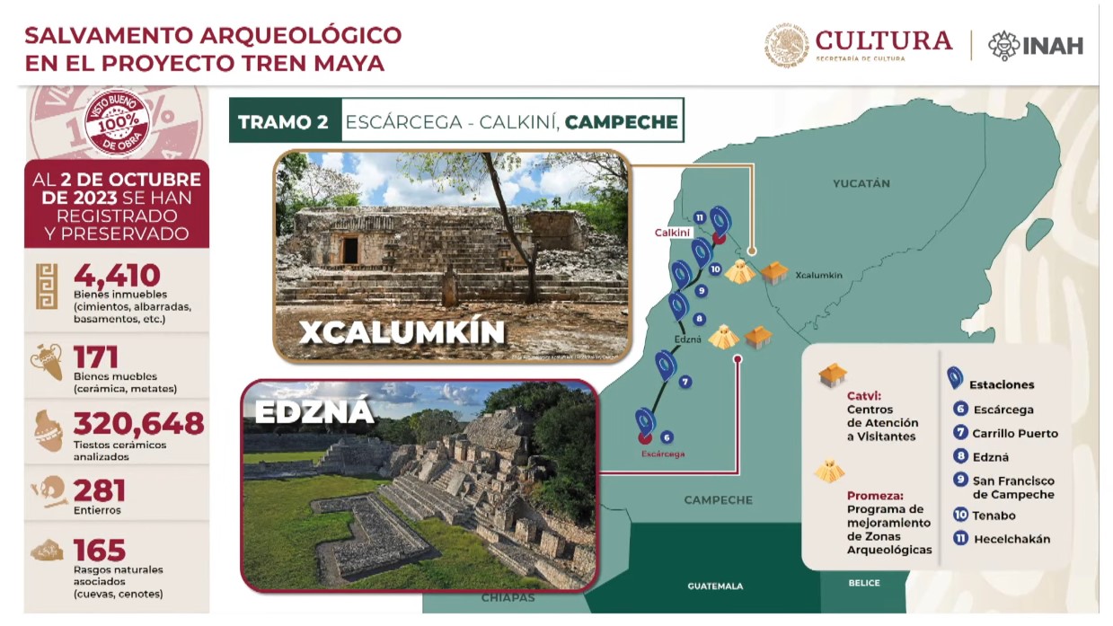 El director general del Instituto Nacional de Antropología e Historia (INAH), Diego Prieto Hernández, reportó que, al 2 de octubre, en el tramo 2 del Tren Maya se han rescatado y preservado: