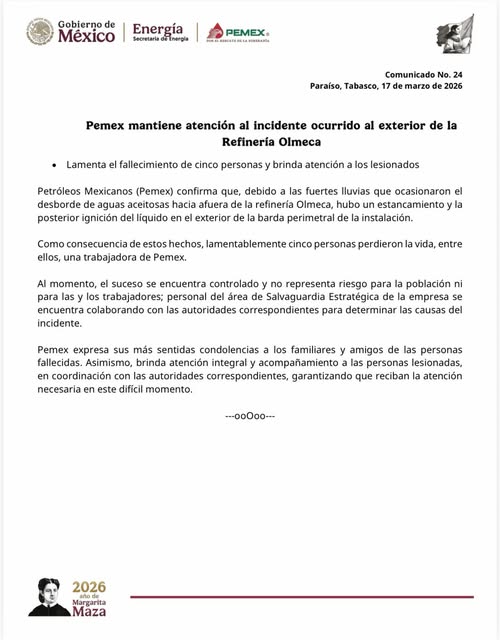 Pemex detalló a través de un comunicado que las instalaciones internas de la refinería no sufrieron daños y continúan operando con total normalidad, sin riesgo alguno para la población ni para el personal que labora dentro del complejo.
