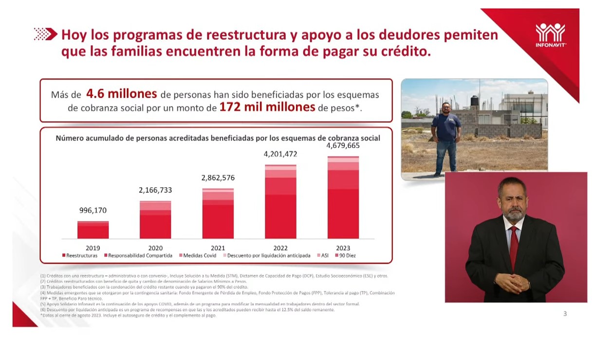 Los programas de reestructura de deuda y apoyo del Instituto del Fondo Nacional de la Vivienda para los Trabajadores (Infonavit) han favorecido a 4.6 millones de familias en el Gobierno de la Cuarta Transformación, informó el titular de la dependencia, Carlos Martínez Velázquez.