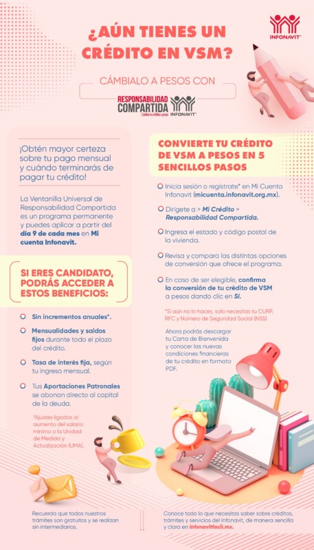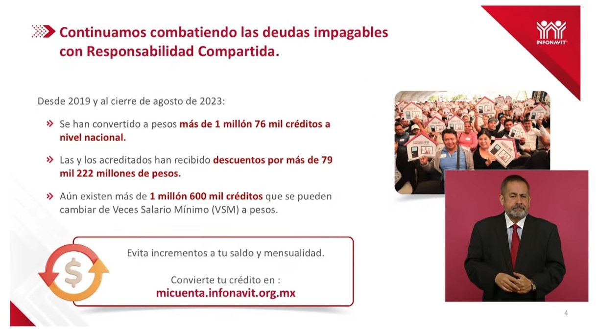 Entre las medidas a favor de los acreditados, dijo, está la de Responsabilidad Compartida, que brinda la alternativa de cambiar un crédito de Veces Salario Mínimo (VSM) a pesos. Con ello, la mensualidad no aumenta anualmente conforme a la inflación, lo que apoya a la fecha a un millón 76 mil derechohabientes.