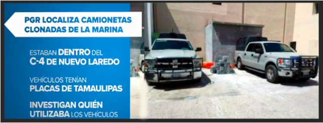 Se trata de dos vehículos que fueron descubiertos por el colectivo de familiares de desaparecidos a manos de la Armada de México. Por aquel entonces el alcalde tenía como escoltas a integrantes de la Marina, aunque las víctimas sospechan que esos vehículos apócrifos, ya que no portaban placas oficiales, pudiesen utilizarse en alguna de las desapariciones que denuncian. El 15 de agosto de ese mismo año, elementos de la fiscalía decomisaron las camionetas en el C4 de Nuevo Laredo.