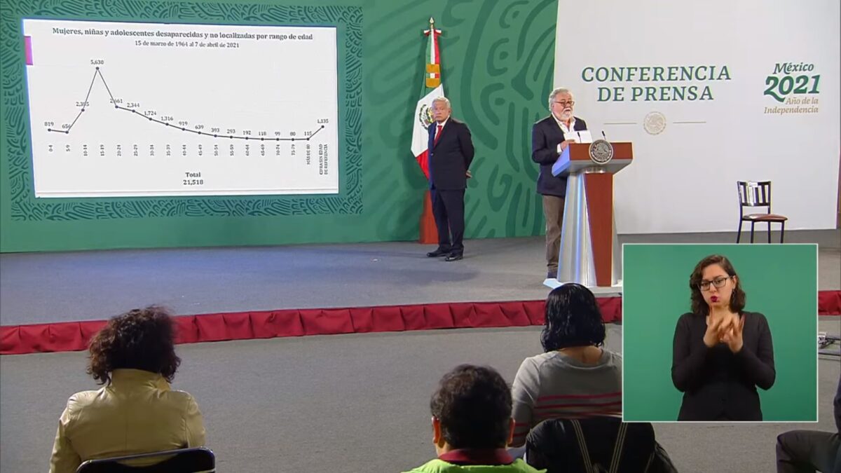Durante la conferencia de prensa matutina en Palacio Nacional, el subsecretario de Derechos Humanos, Población y Migración de la Secretaría de Gobernación, Alejandro Encinas, presentó un informe general de la problemática de personas desaparecidas y no localizadas, con énfasis en la afectación por género.