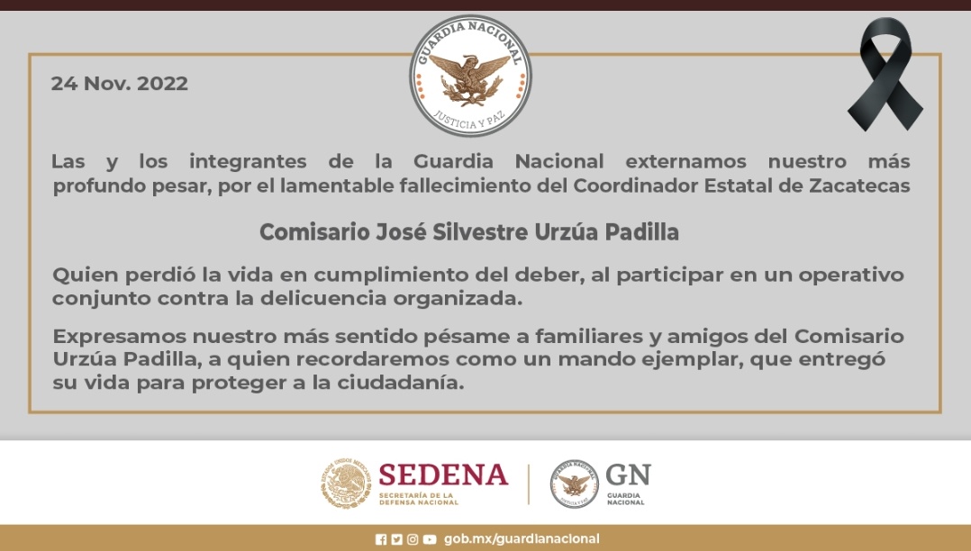 El General Brigadier y Comisario de la Guardia Nacional en Zacatecas, José Silvestre Urzua Padilla falleció en cumplimiento del deber en un enfrentamiento contra miembros de la Delincuencia Organizada. Descanse en Paz y pronta resignación a su familia.