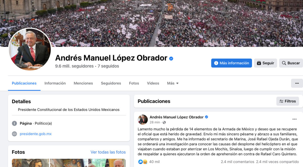 El presidente de Mexico Andrés Manuel López Obrador (AMLO), lamentó esta noche a través de su perfil de la red social Facebook la muerte de 14 marinos en un accidente aéreo en Los Mochis, Sinaloa, en el mismo mensaje también confirmó la participación de los mismos en el operativo donde se detuvo al narcotraficante Rafael Caro Quintero.