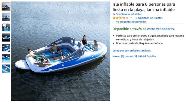 El accesorio se llama «6-Person Inflatable Bay Breeze Boat Island Party Island» para llamar la atención del público, cosa que se ha conseguido rotundamente.