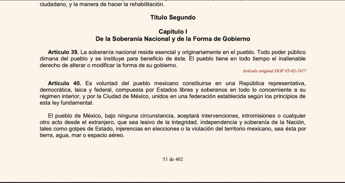 “La soberanía no es herencia fácil ni dádiva pasajera, la soberanía se conquista, se protege y se defiende día tras día. Y para ello, para defender la soberanía se necesitan valores, en las personas y en las instituciones. Las Fuerzas Armadas mexicanas las tienen, el honor que obliga a vivir con rectitud y a saber que cada acción representa México; la lealtad, que significa fidelidad absoluta al pueblo y a la patria; el deber, que empuja a cumplir la misión sin vacilación; el patriotismo, que es amor a la nación expresado en entrega y sacrificio; y la honestidad, que es la base que da sentido y fuerza a todos los demás valores, porque sin ella nada perdura”, destacó para posteriormente dar lectura a la Constitución de 1917.