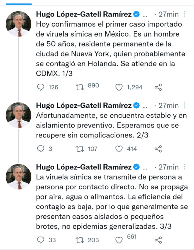 A través de sus redes sociales informó: “Hoy confirmamos el primer caso importado de viruela símica en México. Es un hombre de 50 años, residente permanente de la ciudad de Nueva York, quien probablemente se contagió en Holanda. Se atiende en la CDMX”.