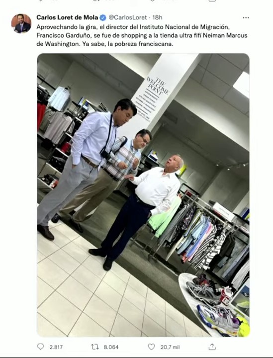 La última del “Paladín de la verdad”, Carlos Loret de Mola, se aventó otra volada en la que asegura que el director del INM, Francisco Garduño, hizo shopping en tienda ultra fifí, lo que el Presidente calificó de “lamentable, de pena ajena”.