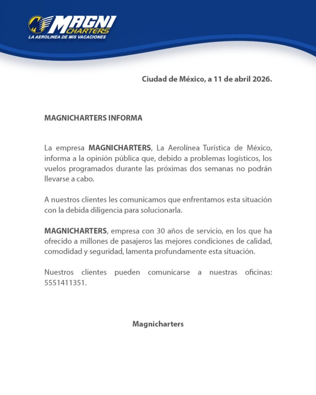 La aerolínea Magnicharters enfrenta un escenario crítico luego de que la Agencia Federal de Aviación Civil (AFAC) advirtió que podría perder permanentemente tanto su concesión como su Certificado de Operador Aéreo (AOC) si no demuestra capacidad financiera suficiente en el corto plazo.