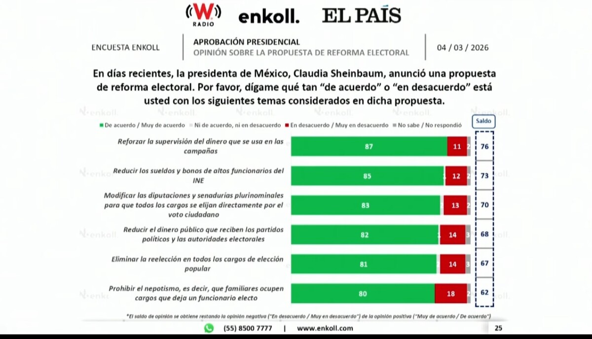 Encuestas reflejan que más de 80 por ciento de las personas están a favor de que se elijan por voto ciudadano las listas plurinominales, baje el costo de las elecciones, del operativo en contra de ‘El Mencho’ y el presupuesto para partidos políticos e Instituto Nacional Electoral, aseguró la presidenta Claudia Sheinbaum Pardo.