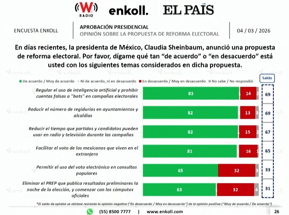 Los únicos apartados que muestran un menor respaldo, que en cualquier caso supera el 60%, son la vía libre al uso del voto electrónico en las consultas populares o la eliminación del PREP, el órgano que publica los resultados preliminares en las noches electorales.