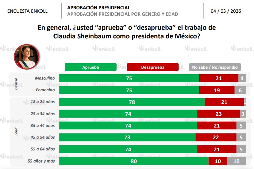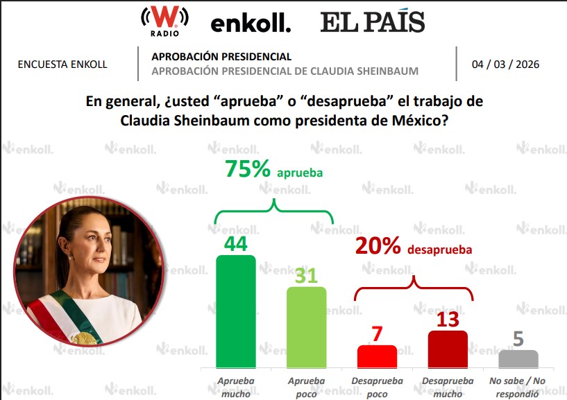 Asimismo, Sheinbaum Pardo registró una aprobación de 75% en marzo, un aumento de un punto porcentual respecto al mes previo, según pesquisas de la casa encuestadora Enkoll, con un respaldo general superior de 80% de la ciudadanía en la operación militar contra “El Mencho” y de la reforma electoral.